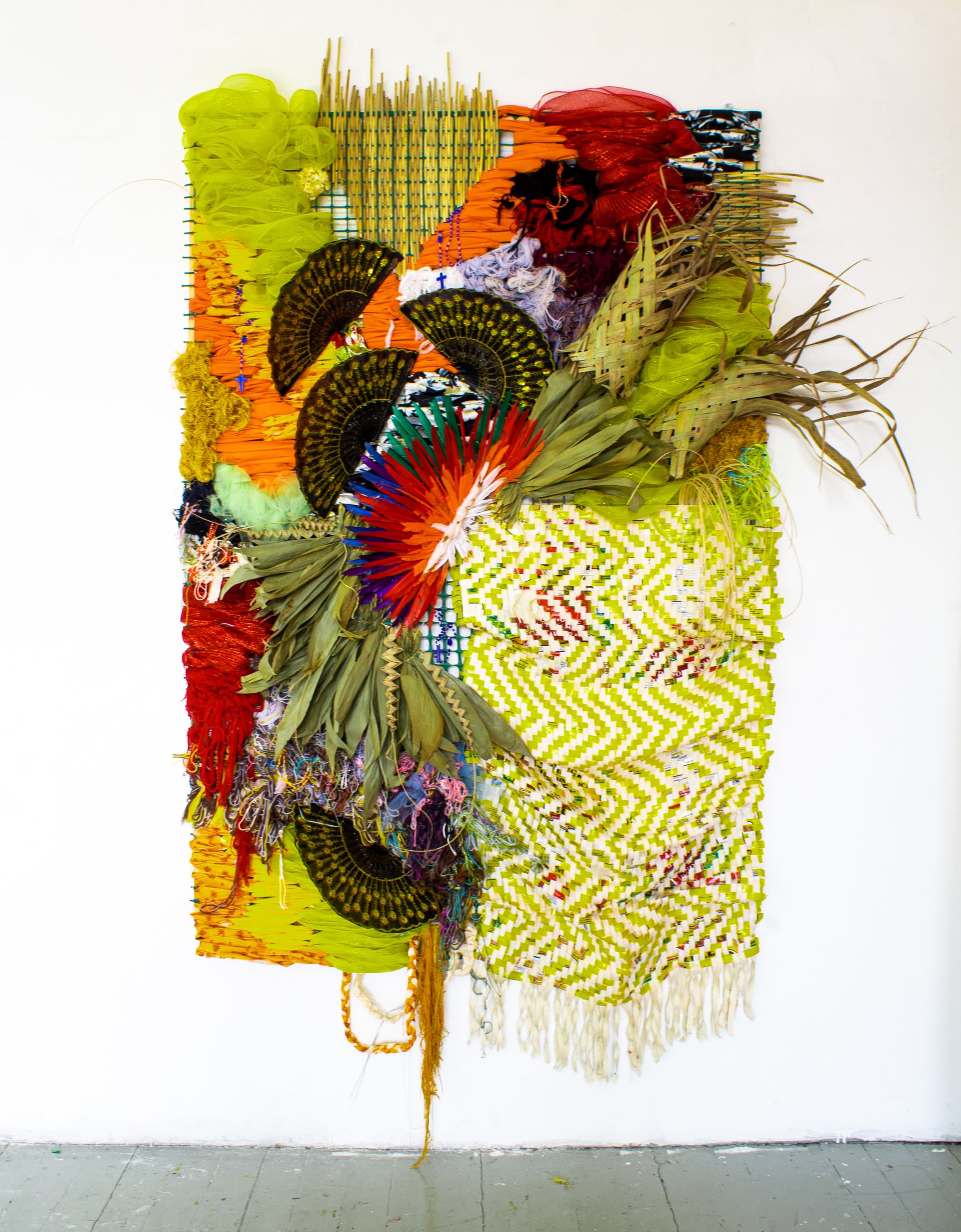 Bhen Alan, Three Hundred Thirty Three, 2022. Woven rice sack and canvas, fans, coconut leaves, abaca, sinamay, bamboo leaves, feathers, found yarn, found thread, fabrics, palaspas, rattan, and industrial plastic fence on stretcher bar. 95″ x 62″. Courtesy of the artist.