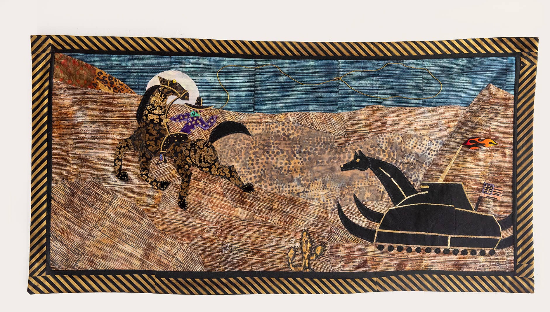Clara Wainwright, The Failed Lasso of the Trojan Rocker, 2024. Fabric collage, acrylic & marker. 46 ½ x 23 ½ inches. Photo by Richard Howard. Courtesy of Paul Deitrich Gallery.