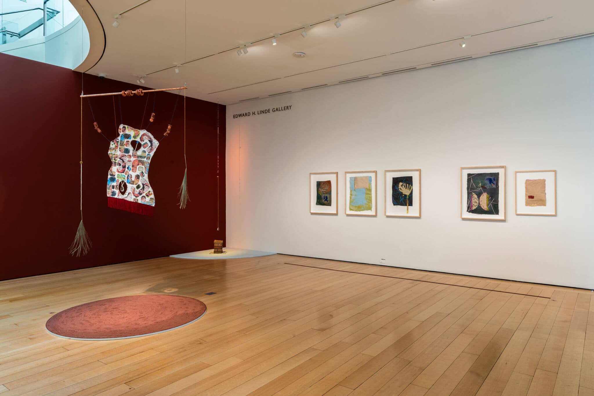 Stitching is a tool to do that. The brick dust is a tool to do that. The brick dust is not really at play in this work, because in an institution like [the MFA]—an encyclopedic museum—the typical material that I would use at the base of a textile, loose brick dust, wouldn’t function in that space because of institutional constraints. So we made this composite material so it won’t fly away or be disturbed. But I’m really interested in those disturbances because even the brick dust, whether for the paper pieces or the textile or even instead of stanchions, creates this protective boundary.